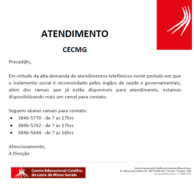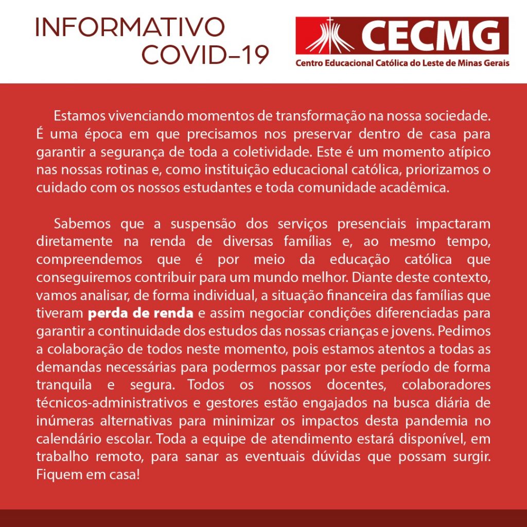 Comunicado SUSPENSÃO DAS ATIVIDADES ACADÊMICAS O Centro Educacional Católica do Leste de Minas Gerais (CECMG) comunica a suspensão das atividades acadêmicas, a partir desta terçafeira (17/03), devido às orientações do Ministério da Saúde, Governo Estadual de Minas Gerais e Superintendência Regional de Ensino. Para garantir a segurança da população e evitar a proliferação do coronavírus […]
